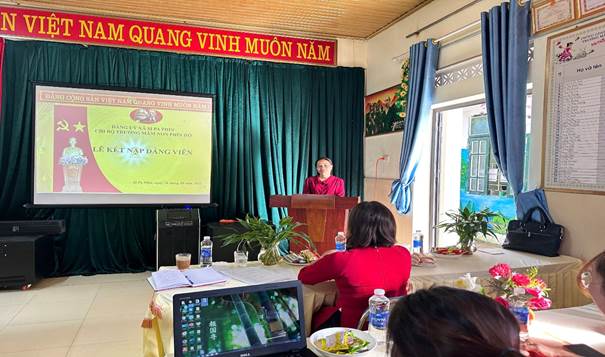 Phát biểu chỉ đạo, đồng chí Bùi Thu Hằng – Bí thư Đảng uỷ xã Si Pa Phìn ghi nhận và đánh giá cao nỗ lực của Chi bộ Trường Mầm non Phìn Hồ trong công tác phát triển Đảng, Đồng chí nhấn mạnh: “Mỗi Đảng viên, nhất là những đảng viên mới, cần tiếp tục rèn luyện bản lĩnh chính trị, gương mẫu trong công tác chuyên môn, góp phần nâng cao chất lượng giáo dục vùng cao và lan tỏa hình ảnh người giáo viên – đảng viên tận tụy vì học sinh thân yêu.”