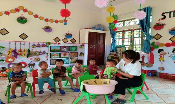 Công tác chăm sóc sức khỏe, dinh dưỡng cho trẻ cũng được chú trọng. Dù còn nhiều khó khăn về điều kiện cơ sở vật chất, nhưng các cô luôn đảm bảo cho trẻ bữa ăn bán trú đầy đủ chất dinh dưỡng, vệ sinh an toàn thực phẩm. Trẻ được theo dõi cân nặng, chiều cao định kỳ, kịp thời phát hiện những trường hợp suy dinh dưỡng để có biện pháp hỗ trợ. Đồng thời, việc rèn luyện kỹ năng tự phục vụ như rửa tay trước khi ăn, cất đồ dùng cá nhân, hay tập ăn gọn gàng cũng được lồng ghép trong các hoạt động hằng ngày.